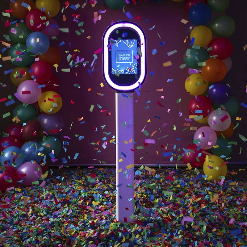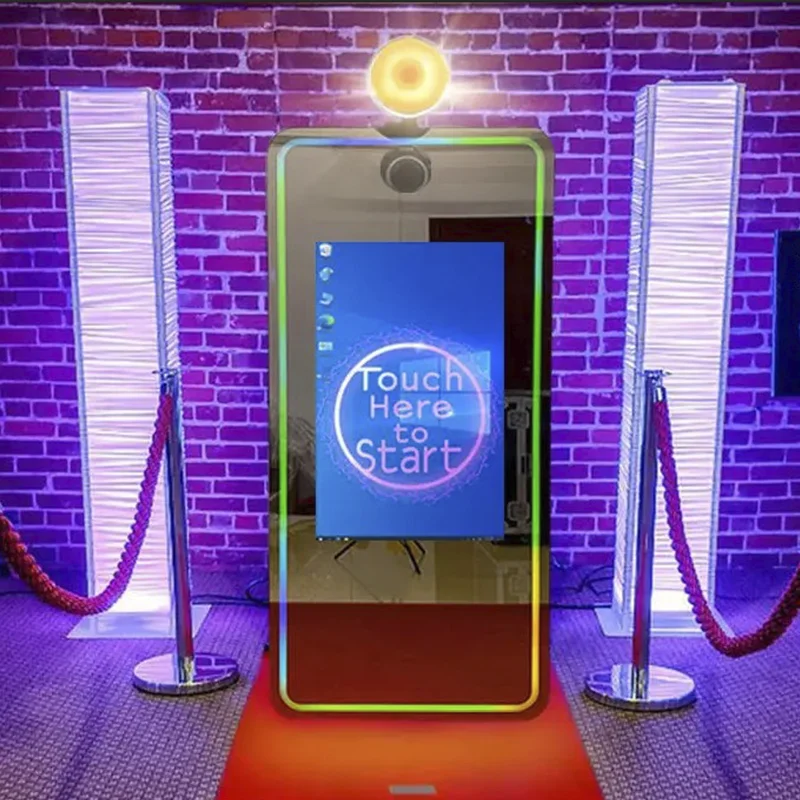 An interactive experience featuring a full-length mirror that comes alive with animations and prompts. Touch the mirror to take photos, sign your prints, and enjoy animated emoji stamps for a truly unique photo booth experience.